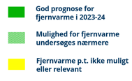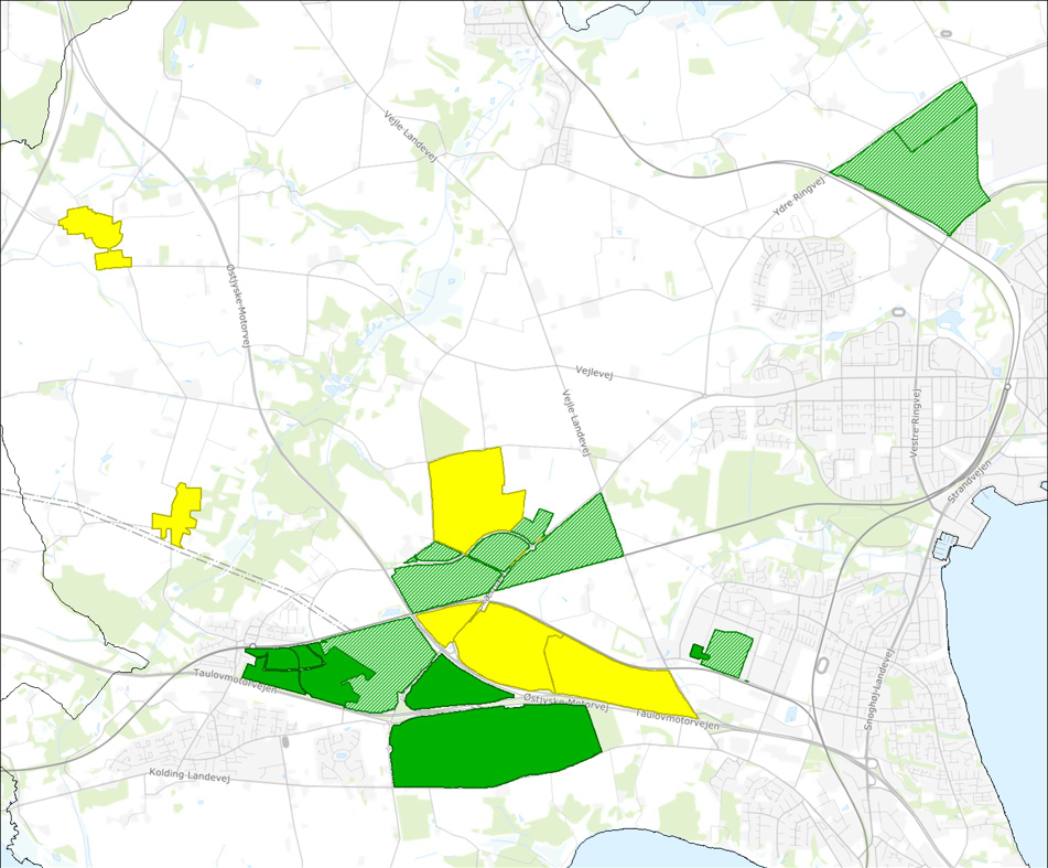Kortet over Fredericia Kommune viser potentielle områder for fjernvarmeudrulning. Grønne områder viser steder, hvor fjernvarmen kan udrulles i 2023-2024. Grønt skraverede områder kræver yderligere analyse, og gule områder er dem, hvor fjernvarme ikke vurderes som muligt, og dermed også de områder hvor der kan søges tilskud til en varmepumpe.