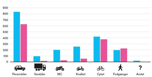 Flere mænd end kvinder kommer til skade på motoriserede køretøjer, mens kønnene er mere ens, når det gælder cyklister og fodgængere.