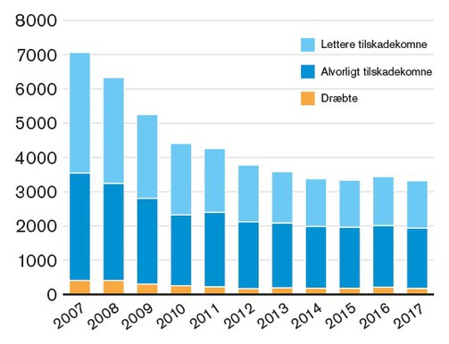 I 2017 var der lige under 3.000 trafikulykker, hvor en eller flere personer blev dræbt eller kom til skade. Det er det laveste antal ulykker med personskade i de sidste 10 år. Det viser nye tal fra Vejdirektoratets ulykkesstatistik.