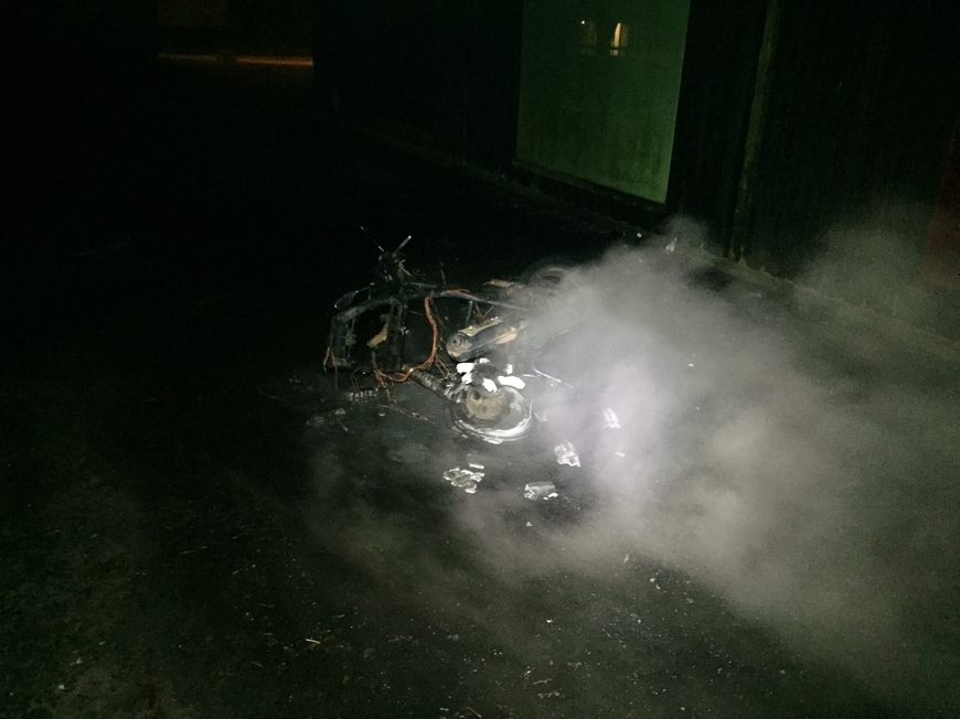 brandvæsnet var fremme ved den brændende knallert/scooter få minutter efter anmeldelsen og kunne hurtigt nedkæmpe flammerne.