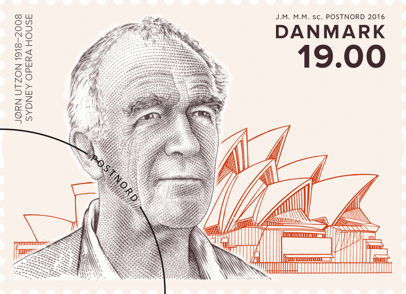 På trods af Danmarks stærke tradition for arkitektur, så er det kun tredje gang, at en arkitekt finder vej til et frimærke. De første var Arne Jacobsen og Poul Henningsen i 2007. På frimærket med Jørn Utzon vises et portræt af den verdensberømte arkitekt og et billede af et af hans væsentligste værker, Sydney Opera House. Og ikke uden grund. Sydney Opera House er et af de mest markante modernistiske bygningsværker i verden, og det værk der gjorde Jørn Utzon verdenskendt.