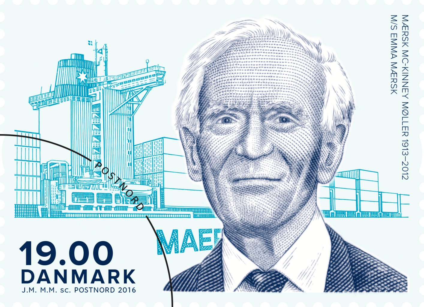 – Jeg og familien værdsætter den fine anerkendelse af min fars virke, som dette frimærke ærer. Vi glædes over, hvordan det er lykkes at omfavne centrale elementer. Skibet Emma Mærsk i baggrunden, opkaldt efter vores mor, Hr. Møllers hustru gennem mere end 65 år. Den hvide, syvtakkede stjerne på skorstenen, familiens og firmaets symbol siden 1886 og ikke mindst navnet MÆRSK, siger Ane Mærsk Mc-Kinney Uggla, A.P. Møller – Mærsk.