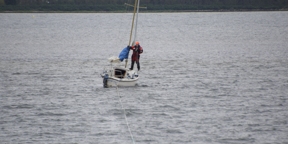 Her viste det sig at blive en kompliceret opgave at få sejlbåden fri. Først forsøgte gummibådsbesætningen selv at få den fri, men lige så snart, de fik den fri, drev den ind på grund igen.