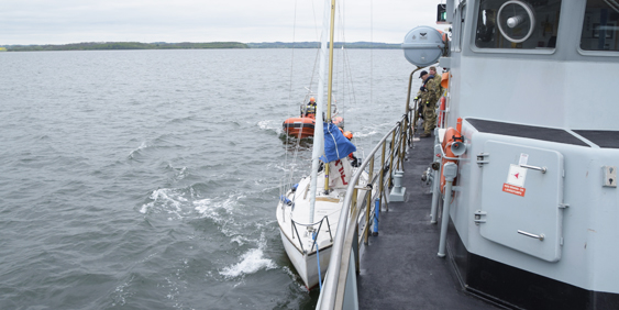En gast fra gummibådsbesætningen blev sat om bord på sejlbåden, og i et samarbejde ude fra sejlbåden og ind til SPEDITØREN lykkedes det til sidst for SPEDITØREN at få trukket sejlbåden fri.