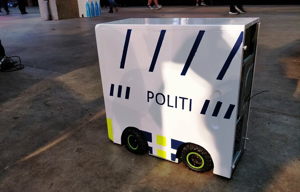 En ung dreng kiggede også forbi med sin helt egen genfortolkning af en bærbar computer – nemlig et fjernstyret computerkabinet på hjul bygget om til en politibil, som vakte stor beundring blandt betjentene.