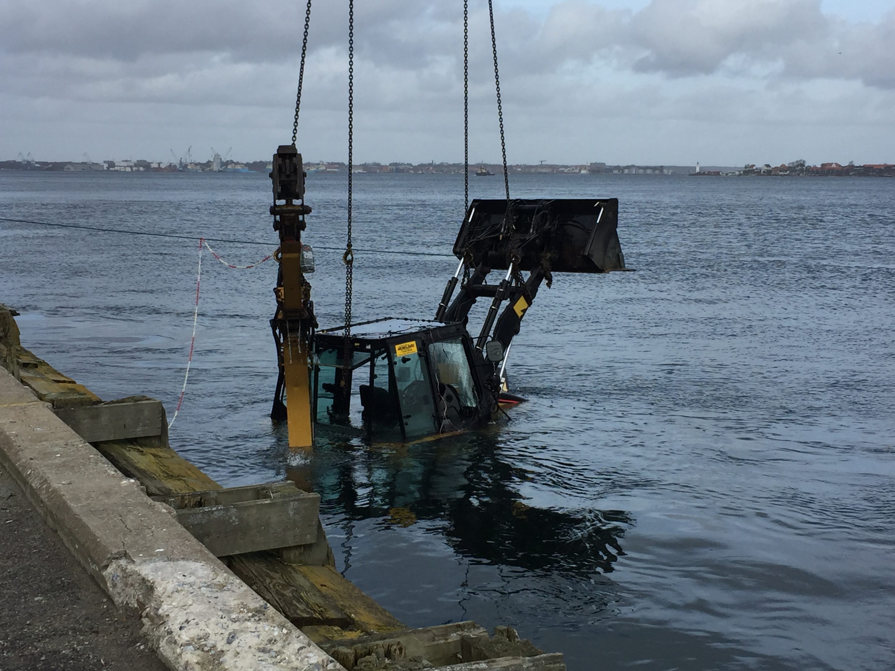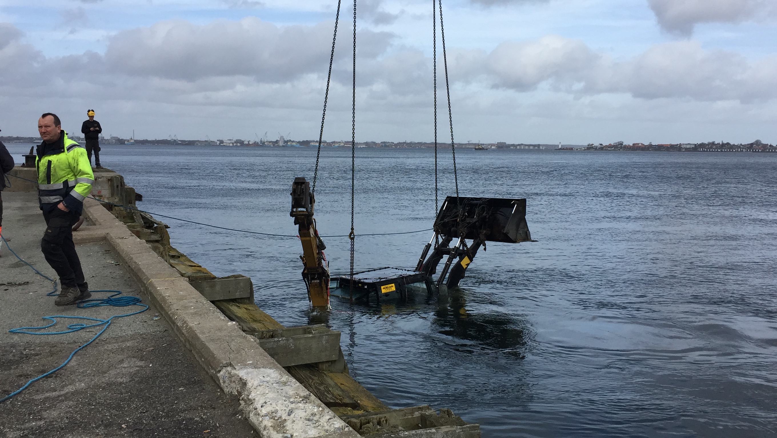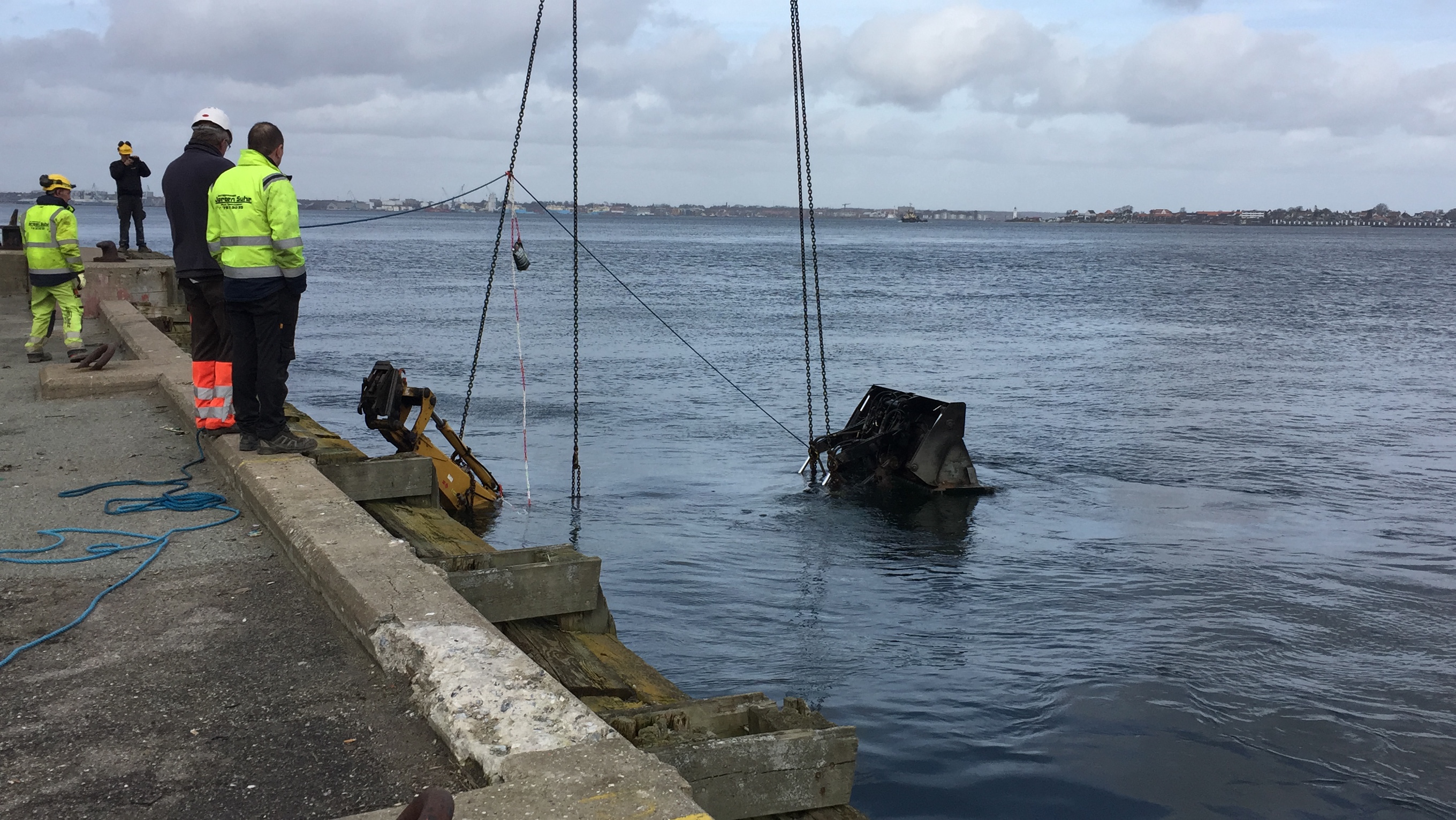 Søndag formiddag blev rendegraveren fundet, og beredskabet har nu hævet den fra havnebunden.
