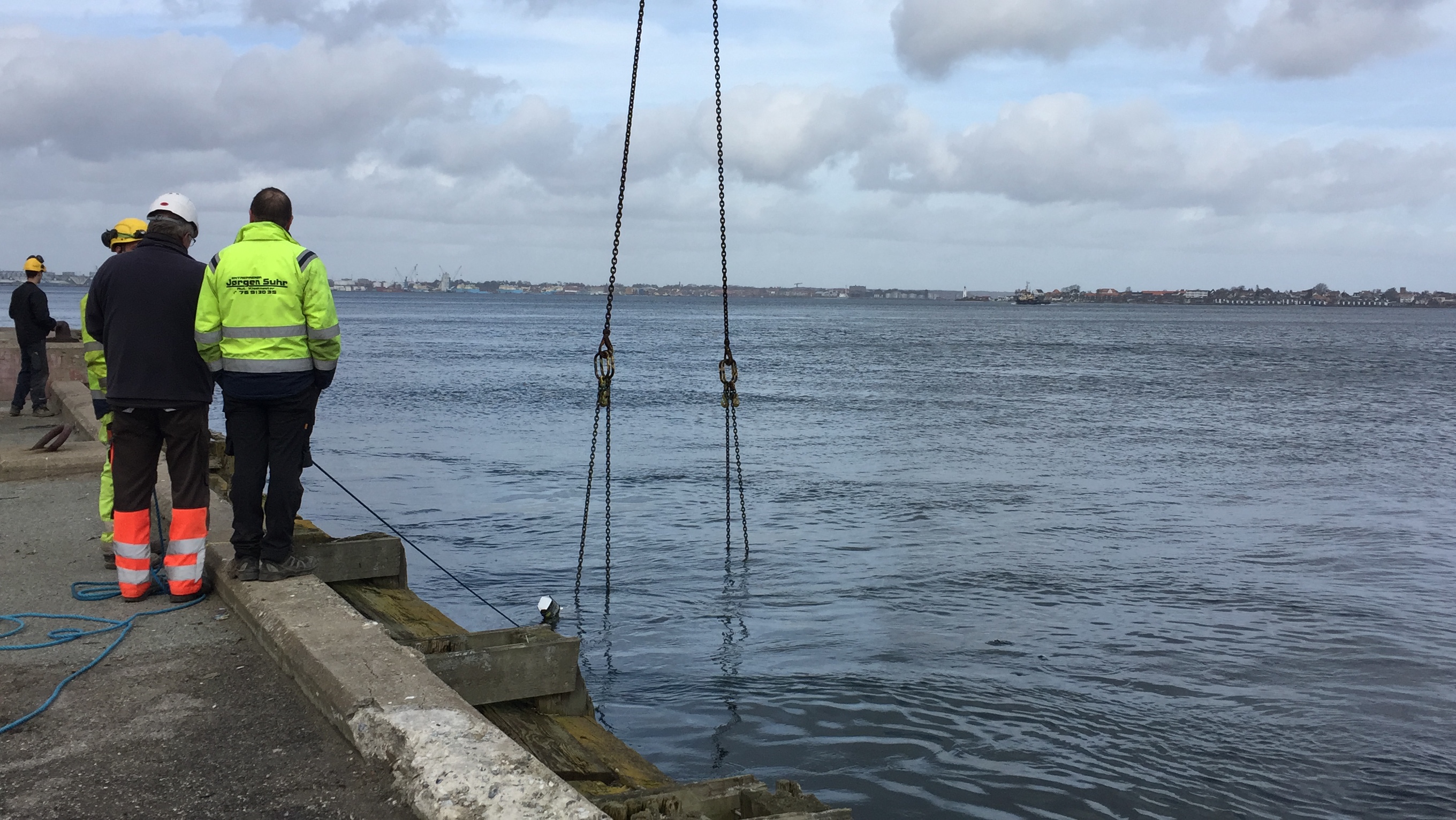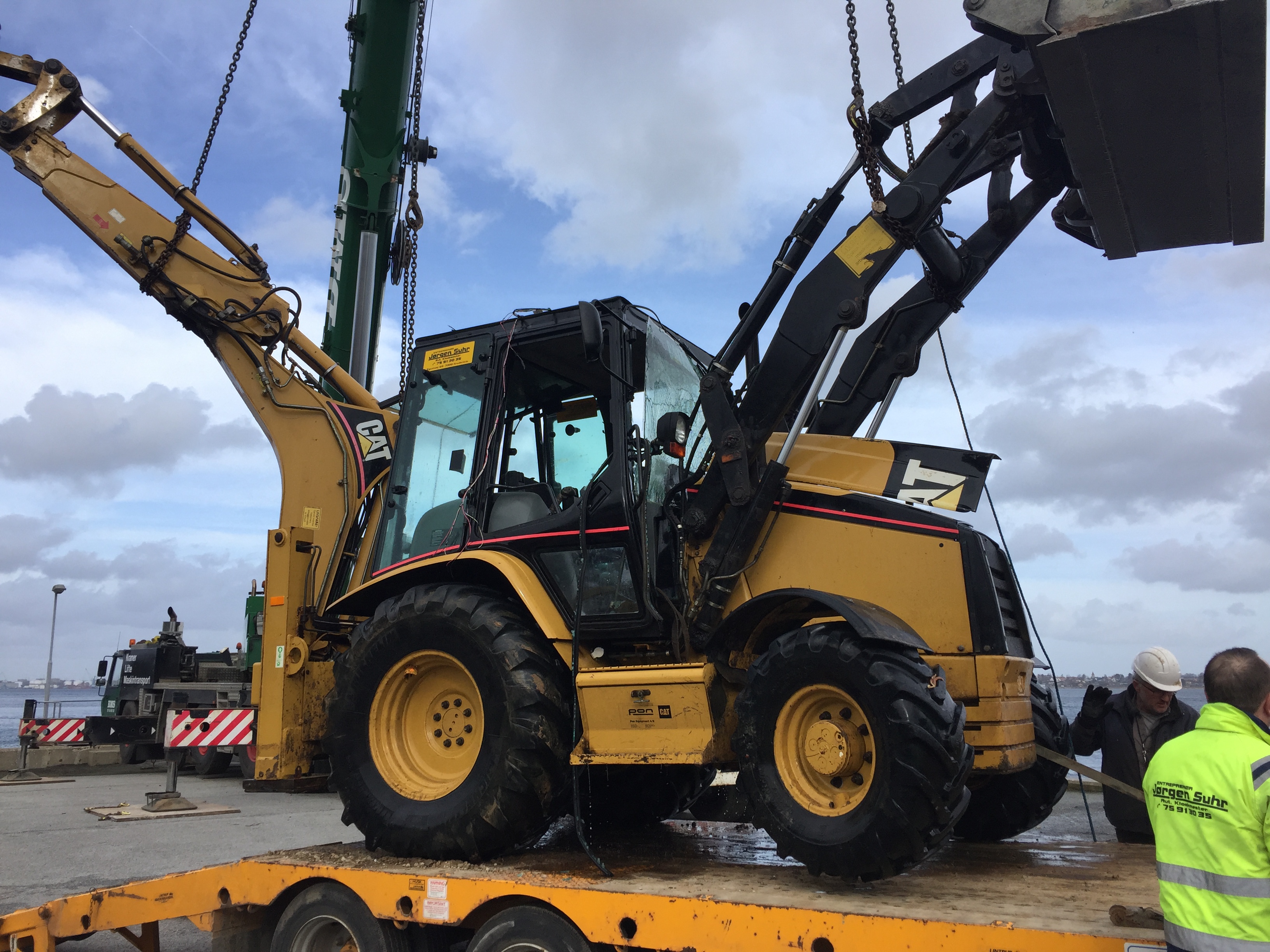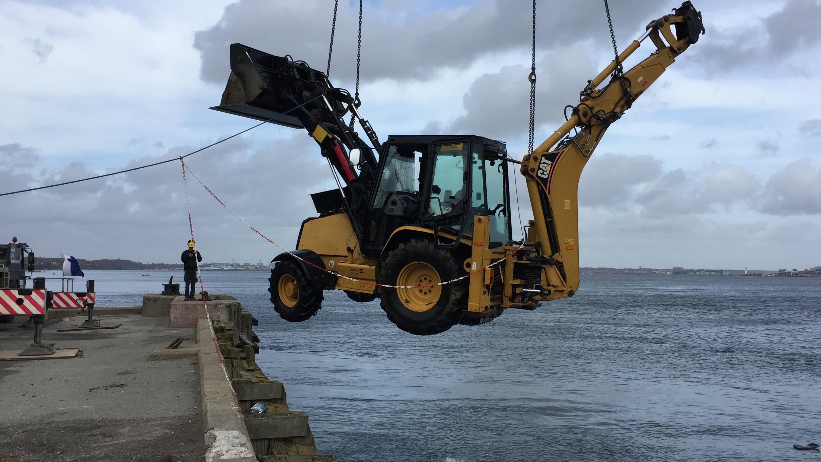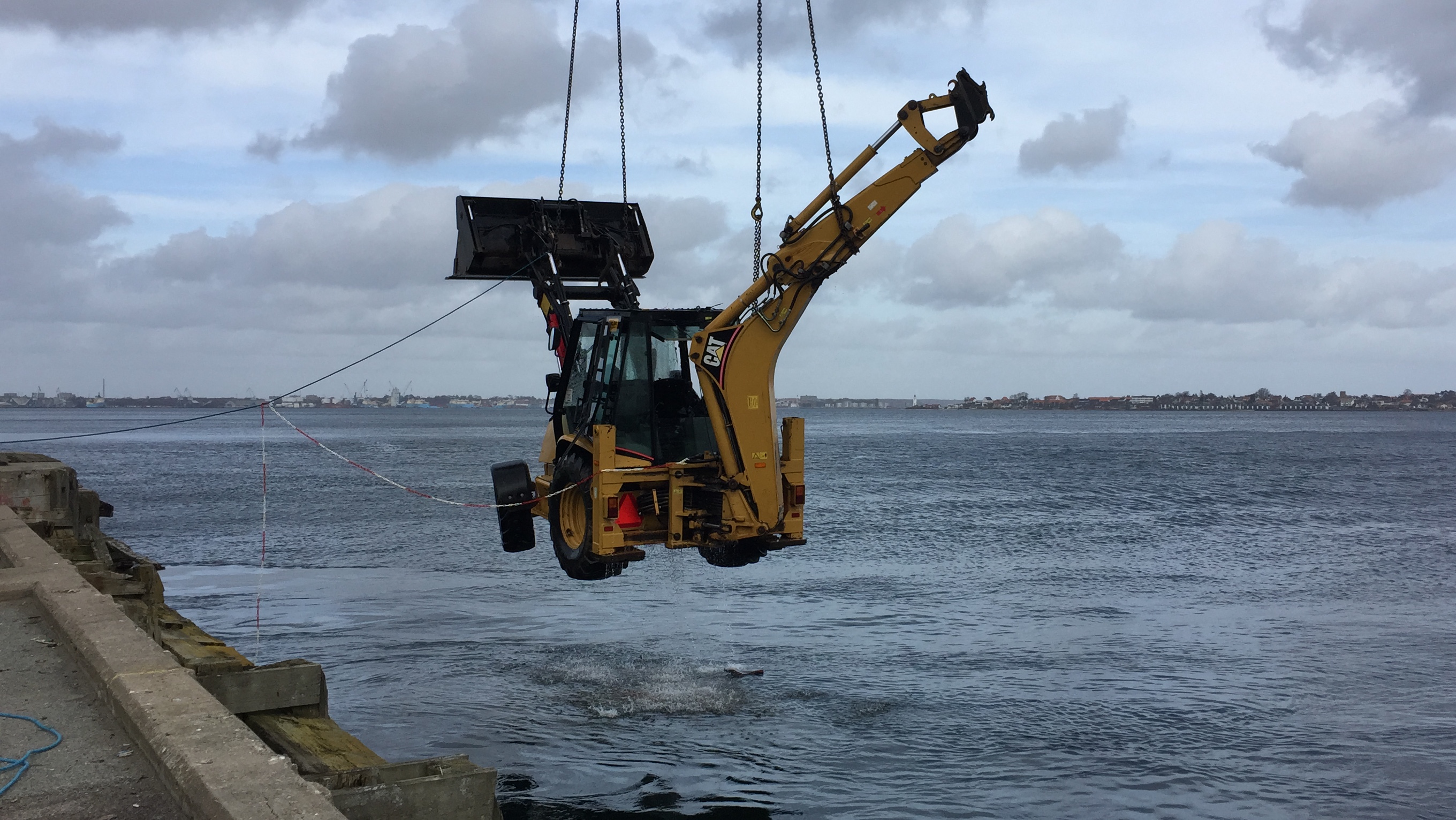Søndag formiddag blev rendegraveren fundet, og beredskabet har nu hævet den fra havnebunden.