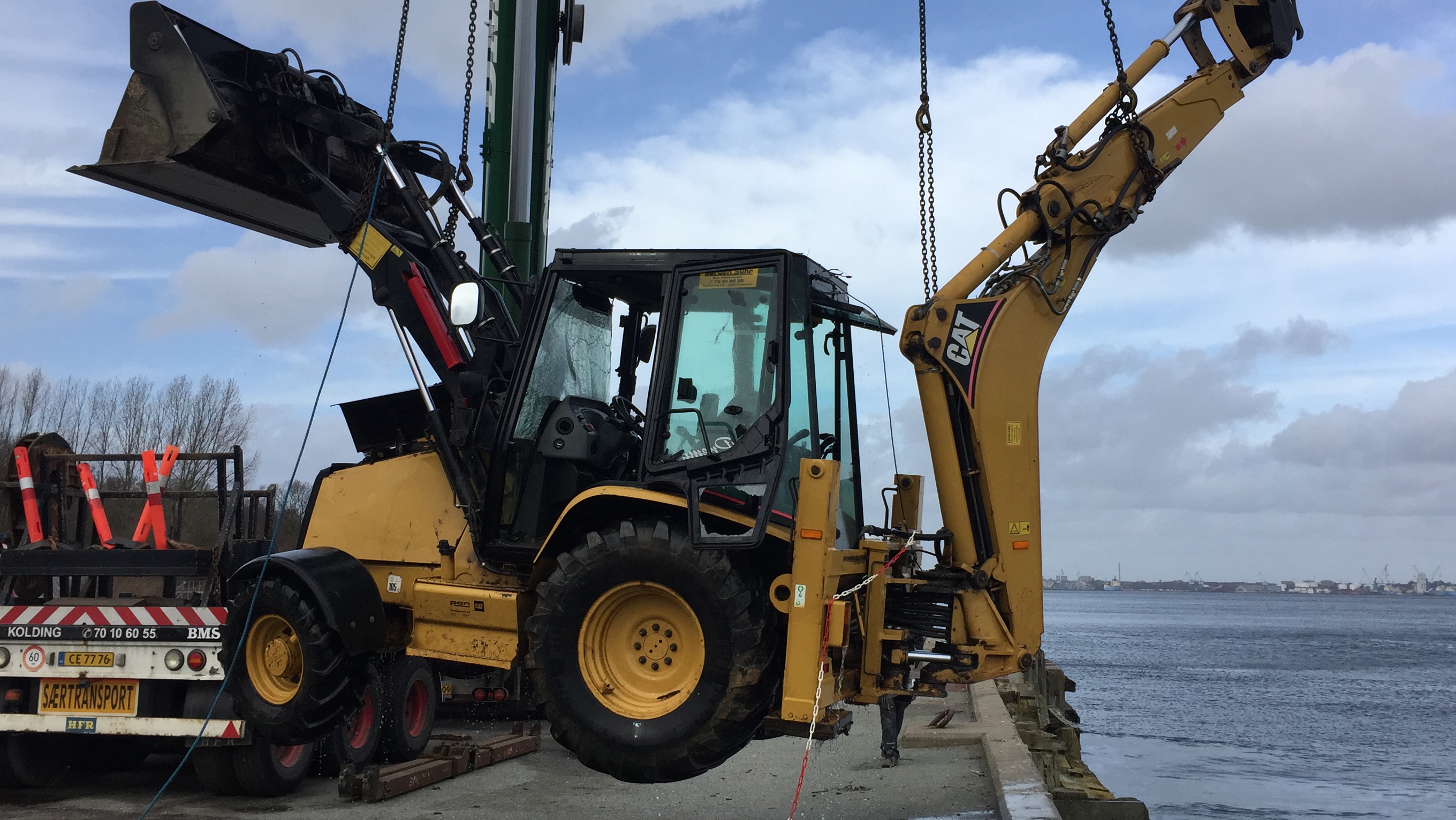 Lørdag aften blev en rendegraver stjålet fra en byggeplads på Ballesvej – søndag formiddag blev den fundet i lillebælt