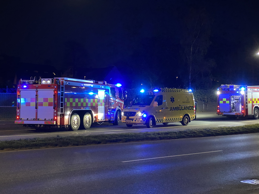 Flere redningskøretøjer deltager i arbejdet ved ulykken, der er sket i sporet, fra Strandvejen – ind mod byen.