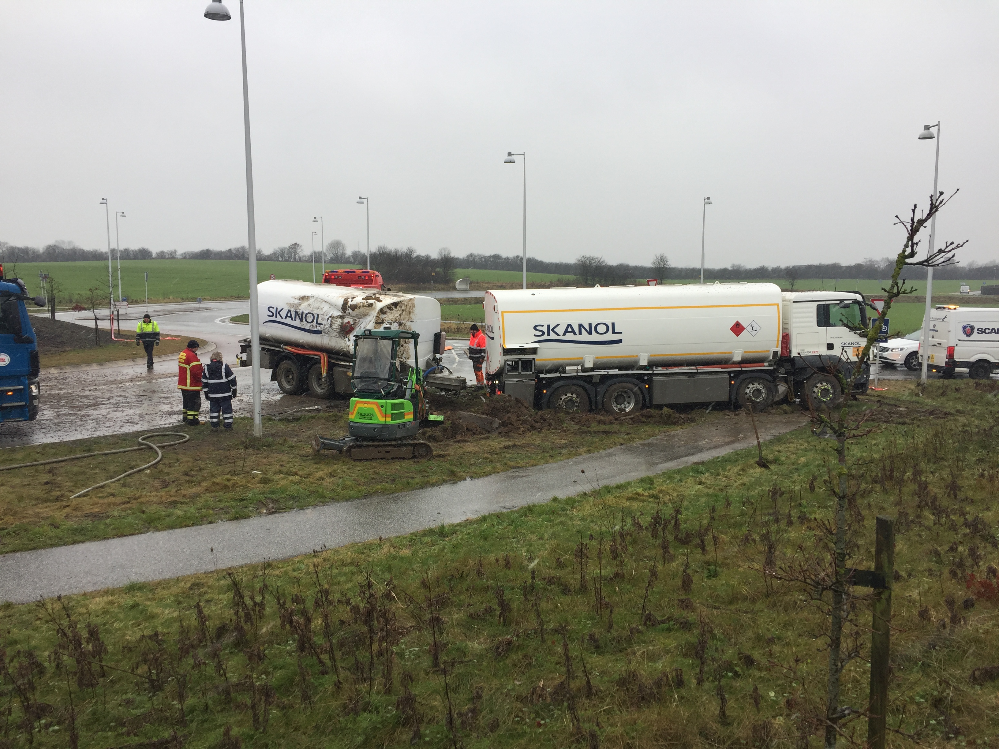 En fuldlastet tankbil med trailer, forulykkede mandag morgen i rundkørslen ved Egeskov, hvorved tankbilens trailer med 17.000 liter diesel væltede.