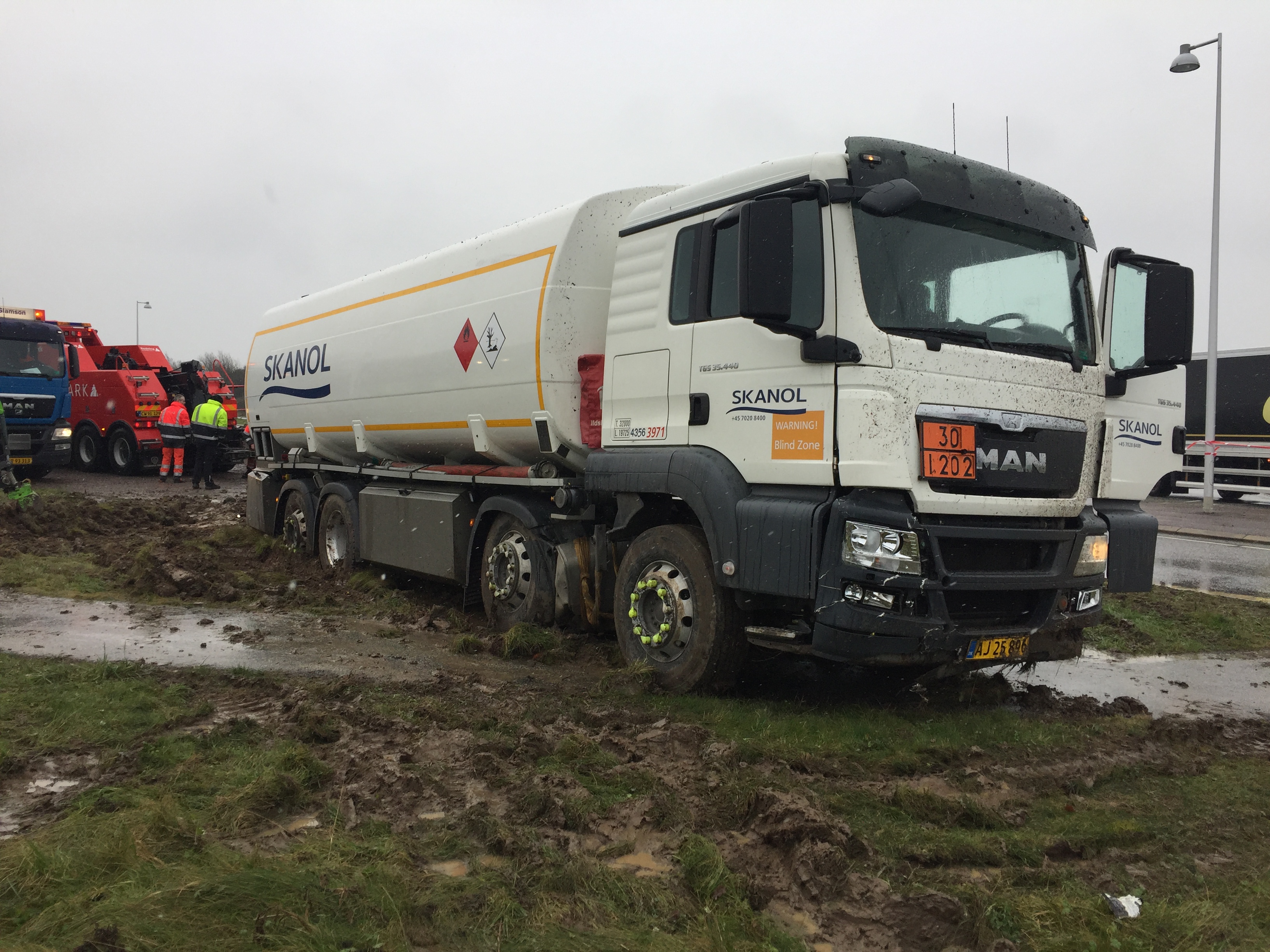 Tidligt mandag morgen forulykkede en tankbil med trailer ved motortrafikvejen ved Egeskov. Traileren er nu bjerget og står igen på fire hjul.