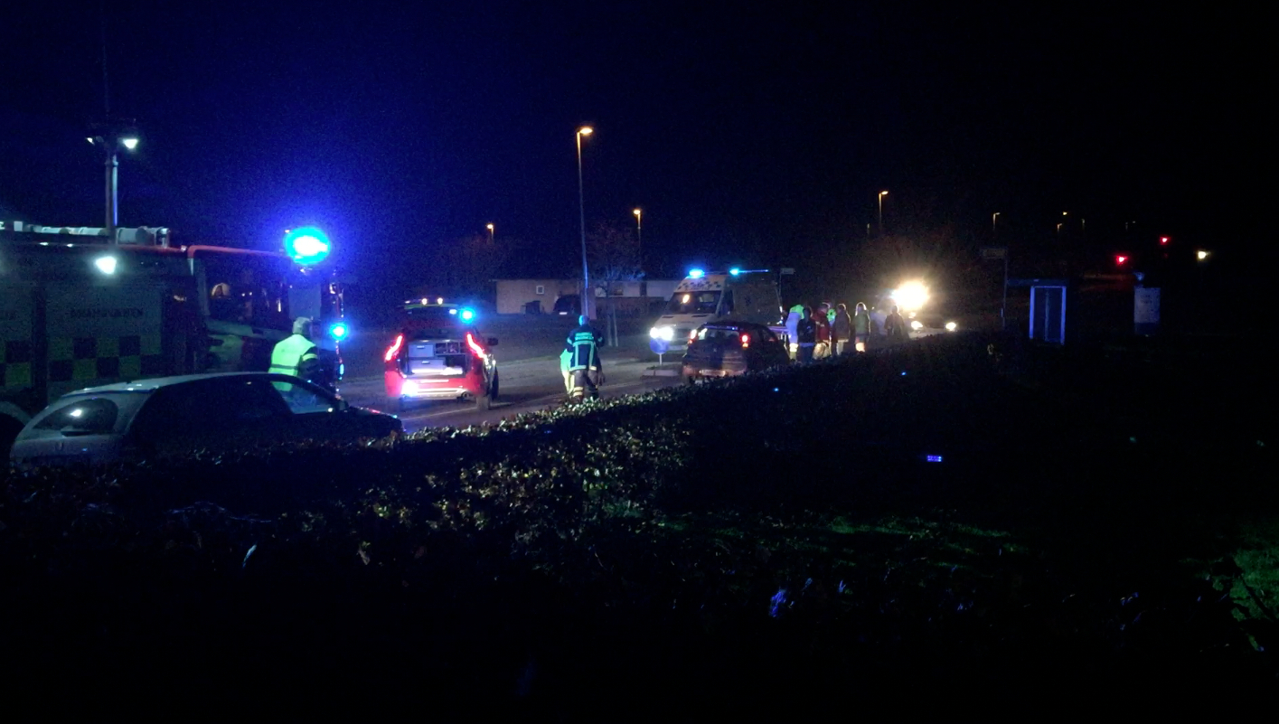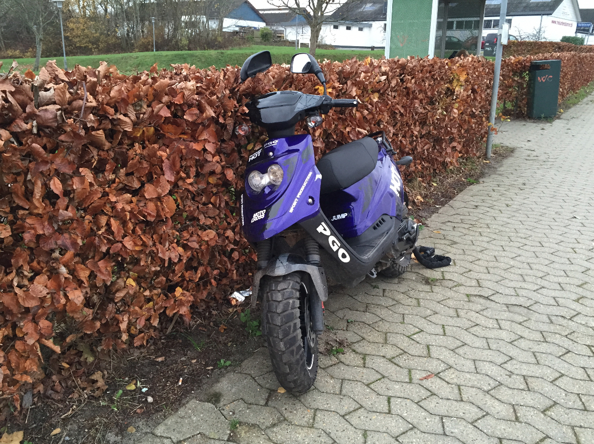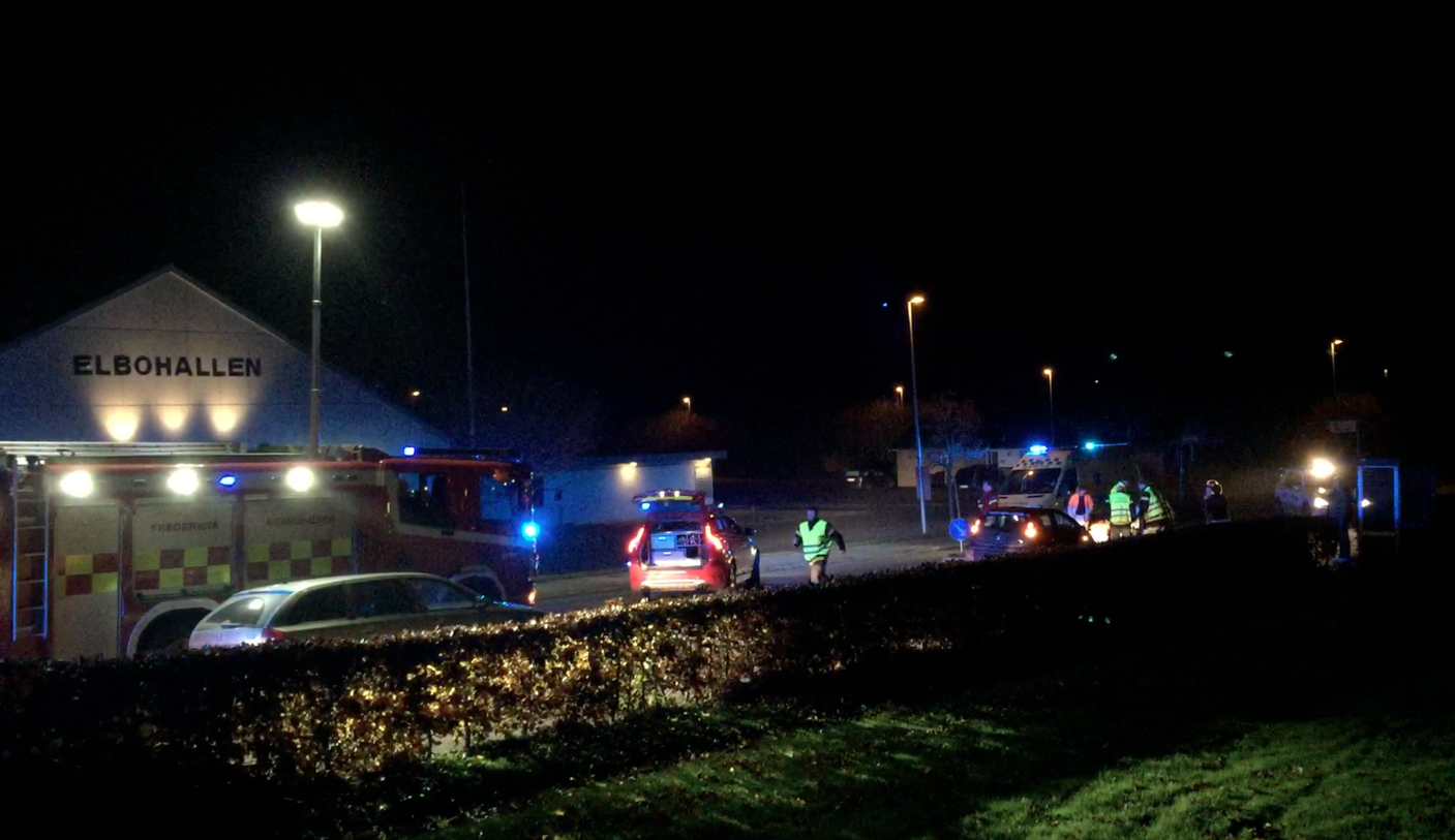 Af ukendte årsager påkører scooterføreren et skilt på en midterhelle på vejbanen ud for Elbohallen. Manden klager over smerter i rygregionen og oplyser til tililende, at han ikke kan flytte sig for smerter. Brandvæsenet ankom kort tid efter sammen med læge og lægeambulance. Den 48-årige mand blev fikseret på et spinboard og kørt til Sygehus Lillebælt i Kolding, hvor han blev efterset for skader. Lægerne kunne konstatere at manden var sluppet heldigt fra sit uheldige møde med midterhellen – med et par blå mærker. Mandens scooter slap ligeledes heldigt fra ulykken.