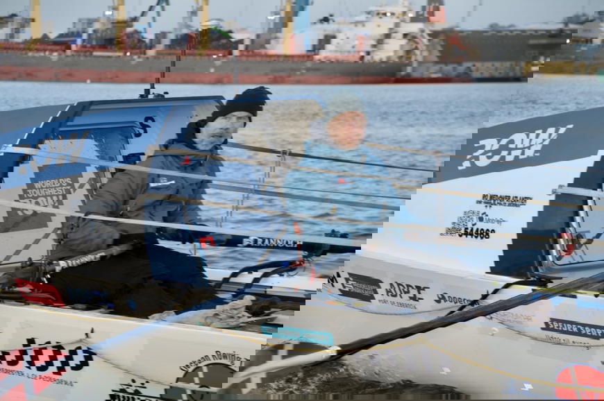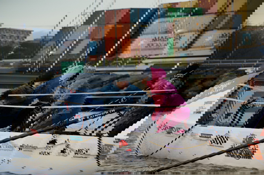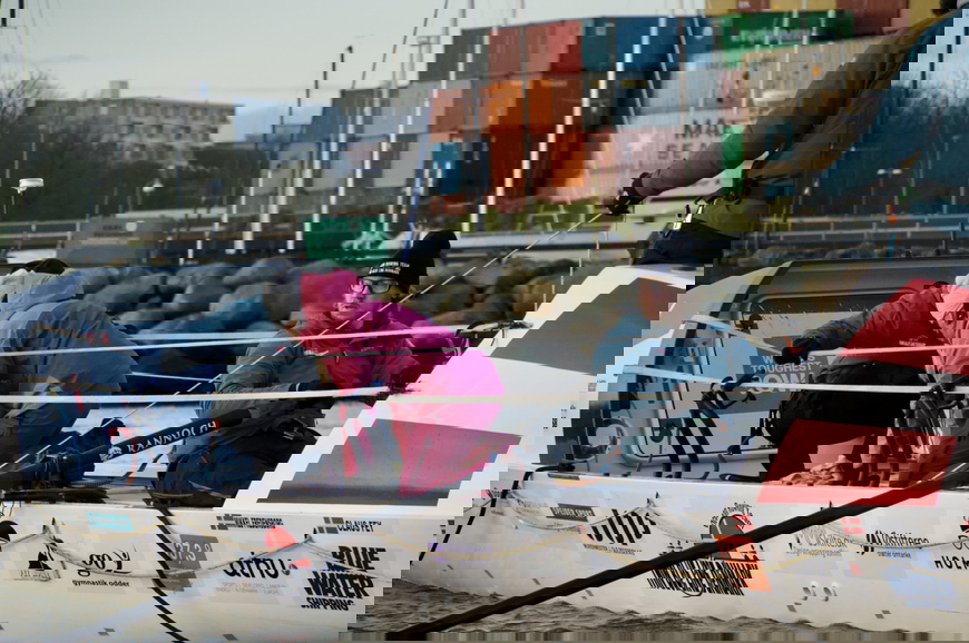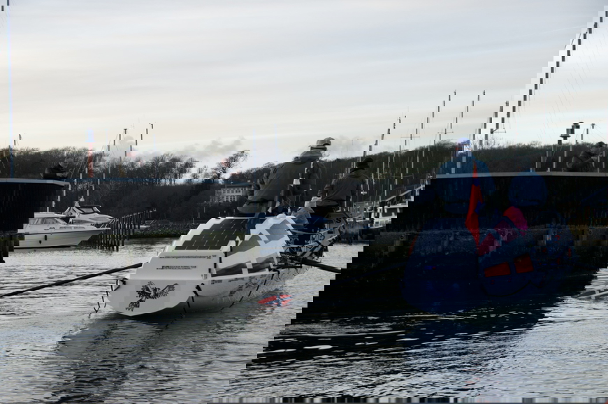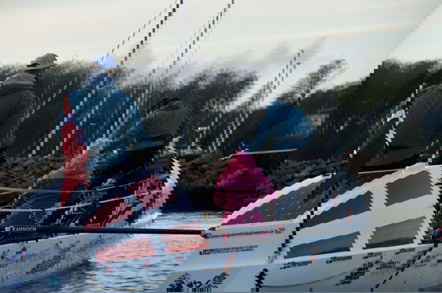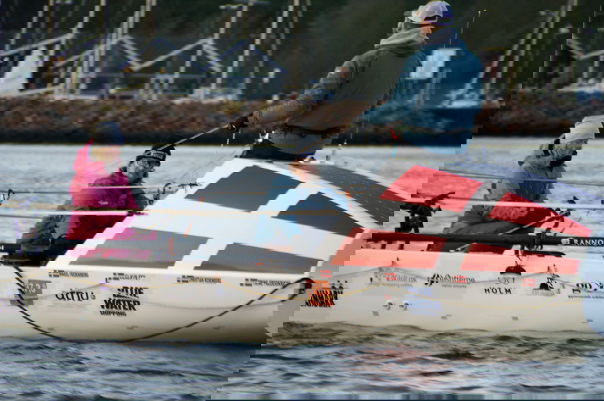 Båden kan styres på flere måder, og på billederne ved ankomsten ses Mikkel Fredensborg Schmidt styre båden med snoretræk. Samtidig ses Trine Frederikke Roe (i midten) sidde passiv hen. Det skyldes, at det “bræt” fødderne skal hvile på, og som med tryk med fødderne kan styre båden, er til reparation. Af samme grund kan der heller ikke roes fra den plads i båden.