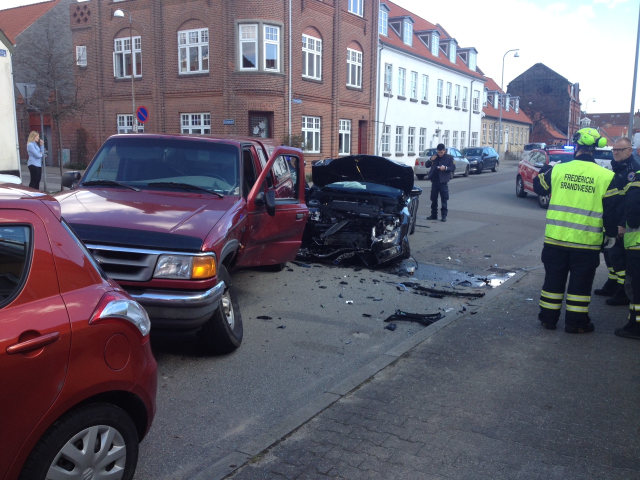 Sydøstjyllands politi oplyser til DanmarkC TV, at en 29-årig kvindelig bilist i en 4-hjulstrækker – en Ford Ranger – overså sin ubetingede vigepligt i krydset Prinsensgade – Dalegade. I krydset påkøres hun af en 22-årig mand i en Skoda Octavia. Sammenstødet er så kraftigt, at kvindens 4-hjulstrækker slynges over i en tredjepart – en Suzuki Swift, ført af en 43-årig mand.