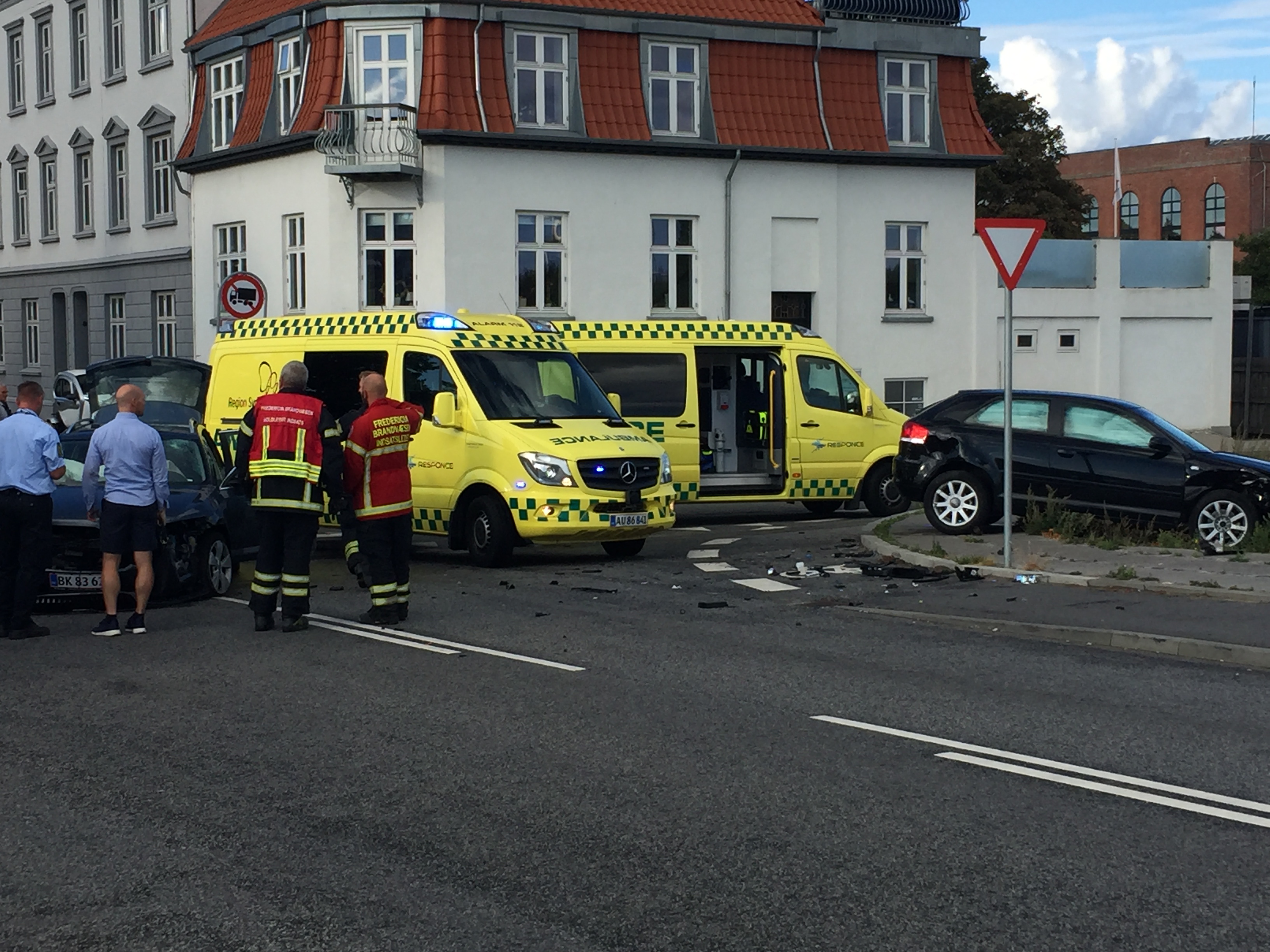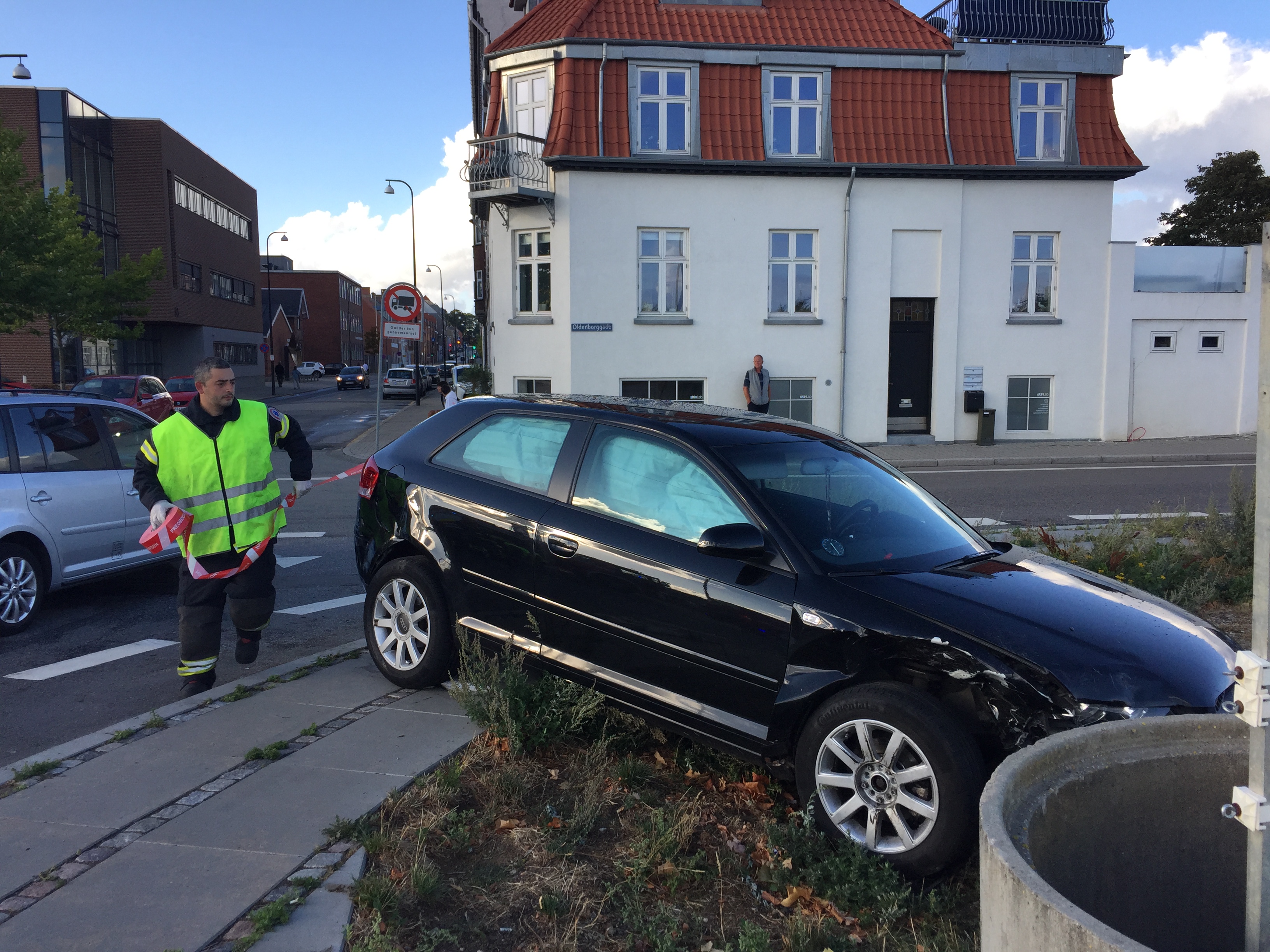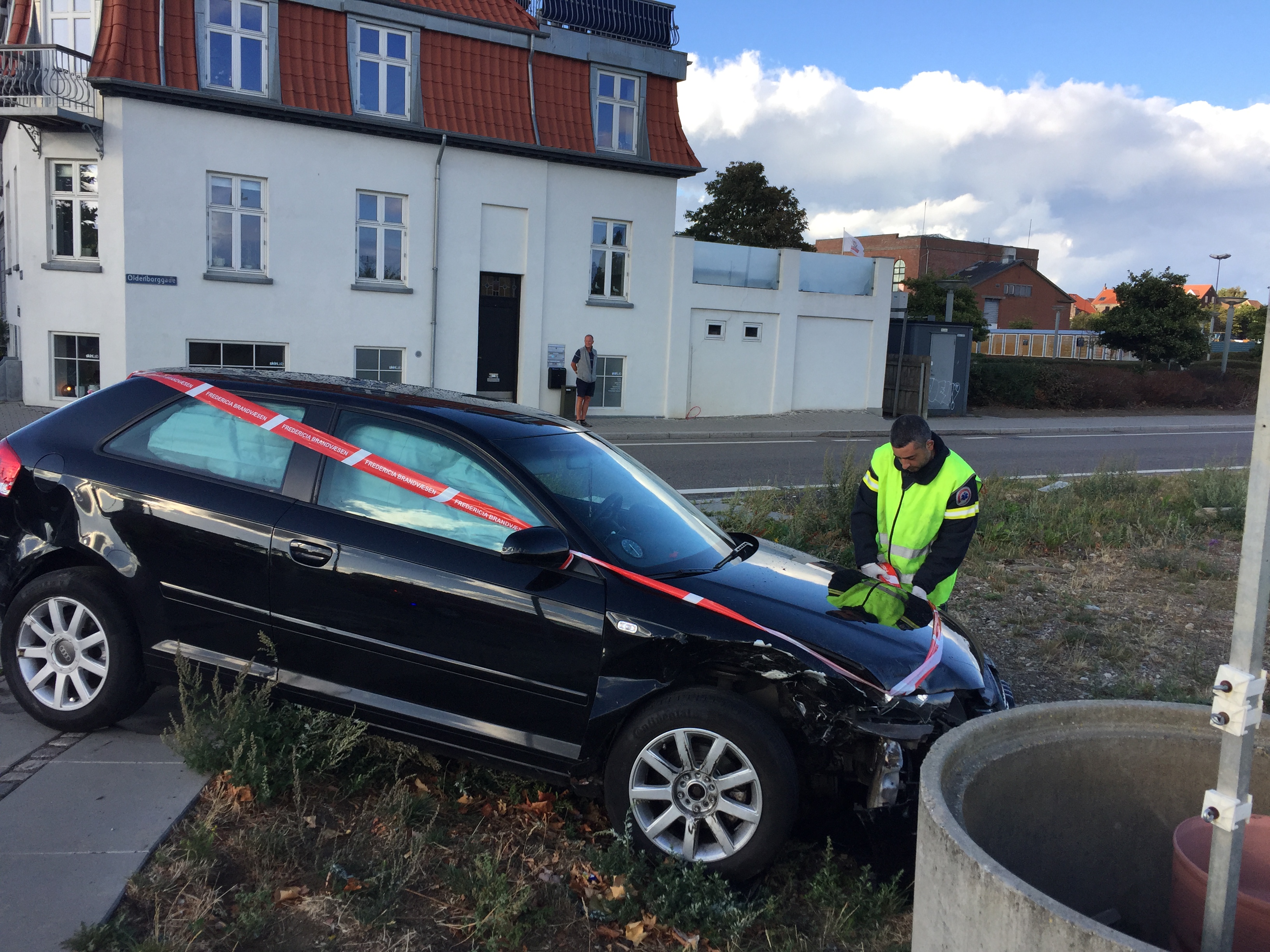 En 24-årig ung mand fra Vejleområdet, overså sin ubetingede vigepligt, og kørte direkte fra Købmagergade – og ud i krydset i Oldenborggade, hvor han kører ind i en bil, ført af en 42-årig mand fra Fredericia. Airbags i begge biler blev udløst ved sammenstødet.