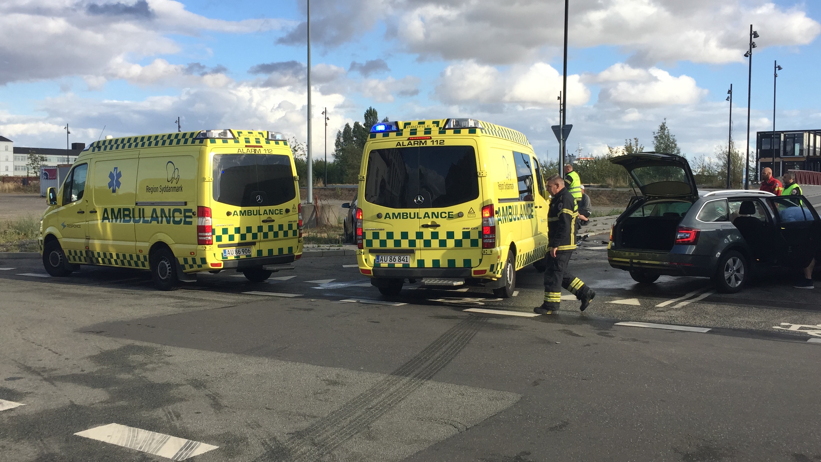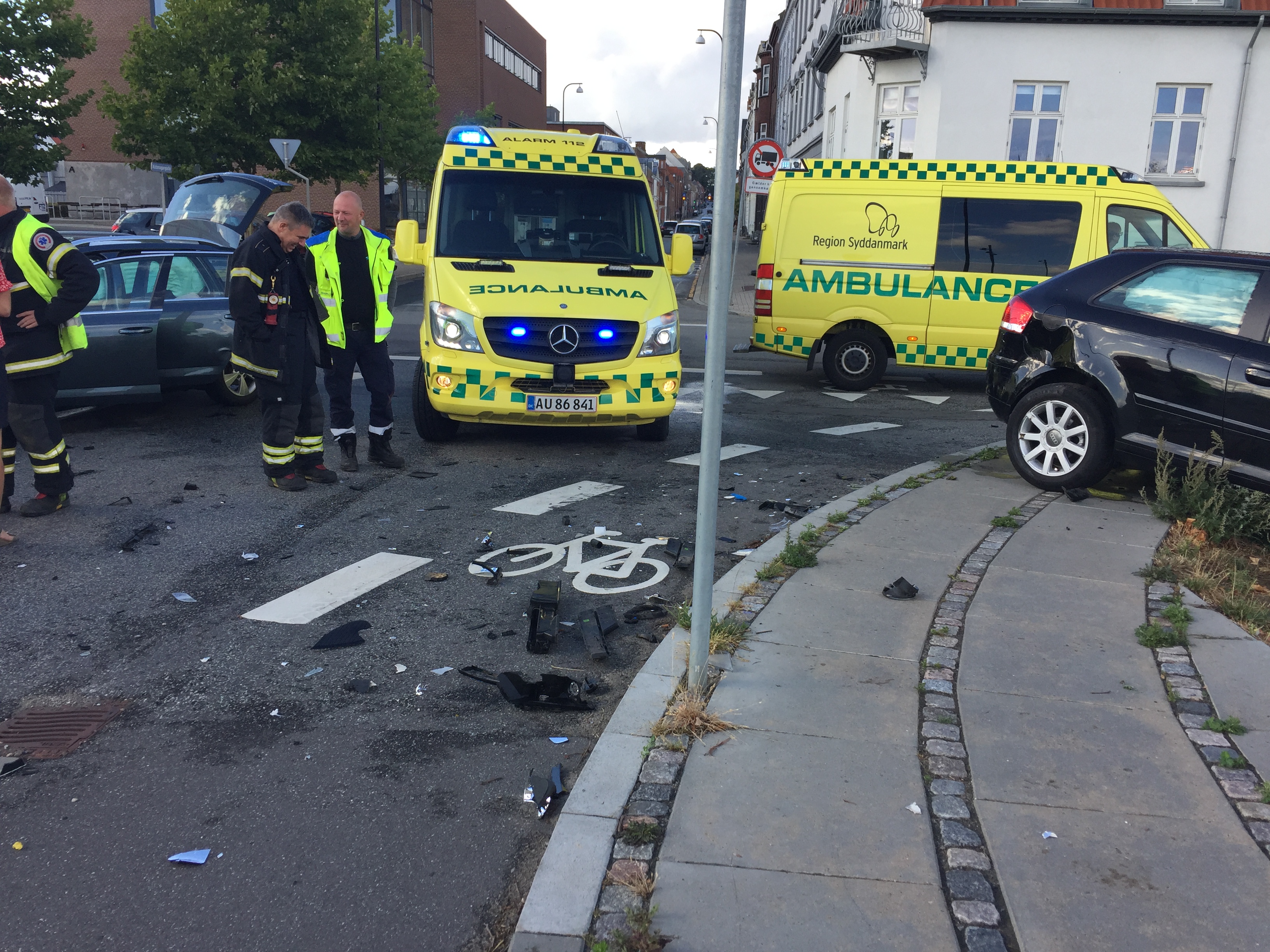 To personer måttet tilses i ambulancer, efter at de lørdag aften kort før klokken 18.30, var impliceret i er færdselsuheld i krydset Købmagergade – Oldenborggade i Fredericia.