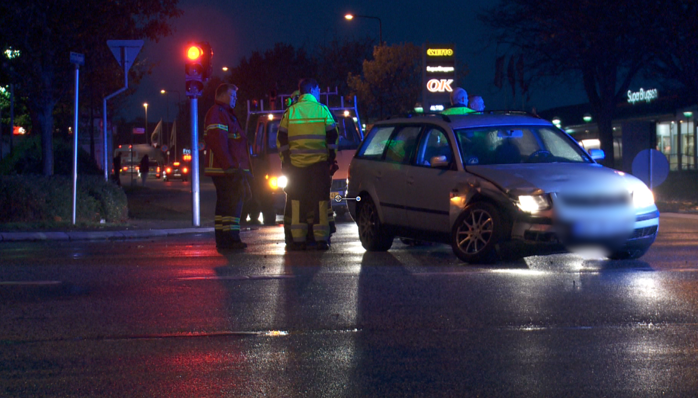 En varebil kører på Snoghøj Landevej mod syd, og kører ud i krydset for rødt lys. Her kolliderede den med en personbil der kører ud i krydset fra Erritsø Bygade – og ville svinge til venstre ind mod byen. Ved sammenstødet der skete med ca. 70 km./t. skete en del materielle skader og en person måtte køres på sygehuset – Oplyser Sydøstjyllands Politi overfor DanmarkC TV