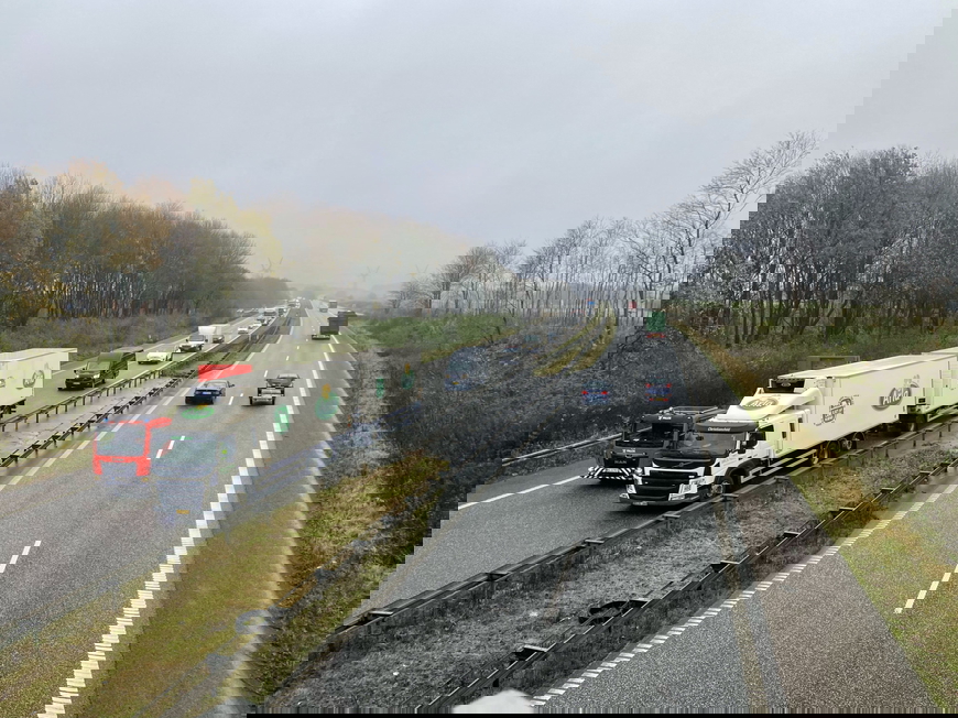 Lige nu er der ved at danne sig kø, og der er kun et farbart spor, meddeler Vejdirektoratet.