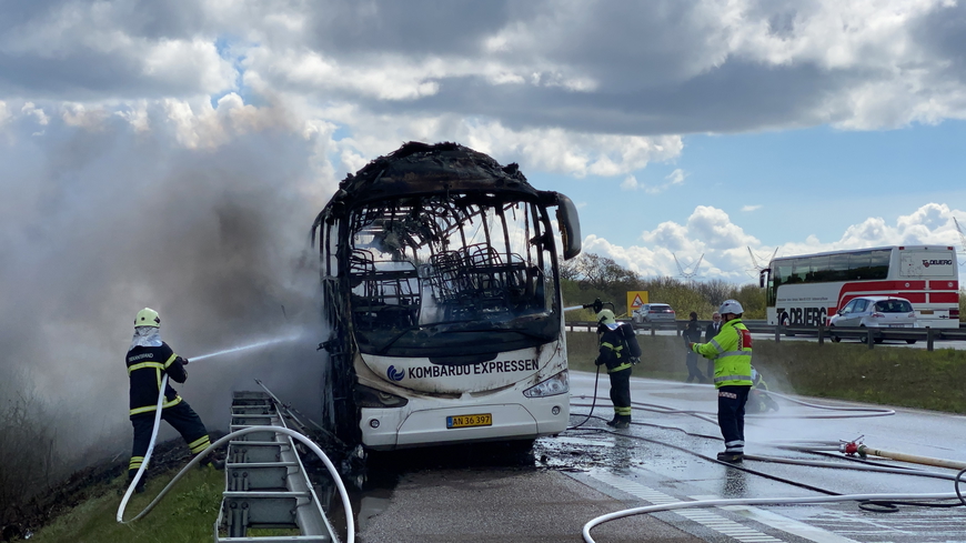 En turistbus, brød lørdag kort før middag, i brand på Taulovmotorvejen, kort før afkørsel 60B.